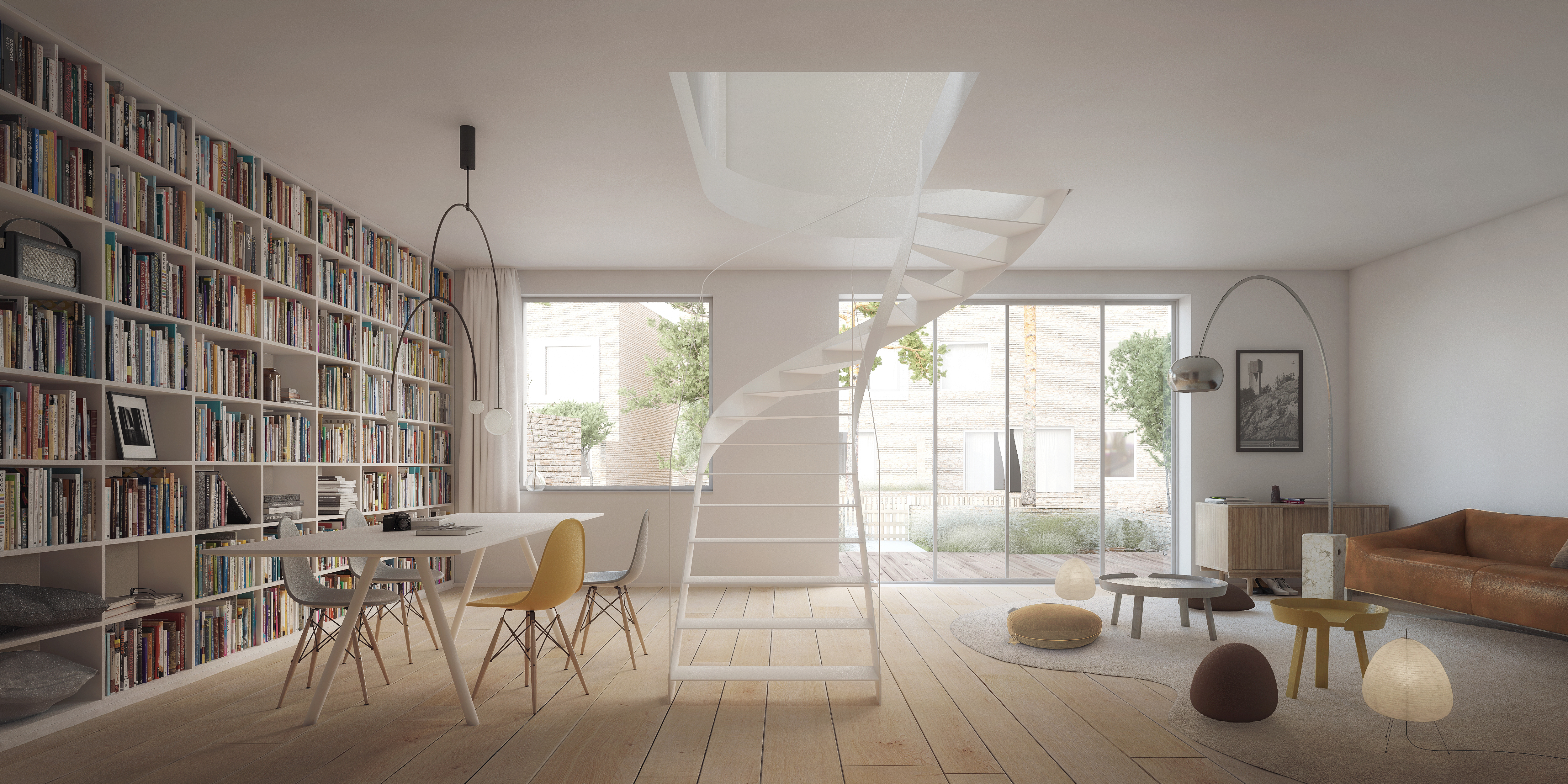During the 16th century the town of Vadstena was one of the most important pilgrimages destination in Europe due to its Bridgettine abbey. The quiet demenaor of the village brick and stone building, its low density and large grassy yards enclosed by low stone walls inspired in the building’s choice of materials and site layout. As the site is very near the water it was decided to equip the houses with large roof terraces where the residents could enjoy lakeviews. The higher stair volume necessary to reach the roof became both an opportunity to create an unique formal expression in facade and to create double height studio-like spaces on the second floor. Project developed at Sandellsandberg